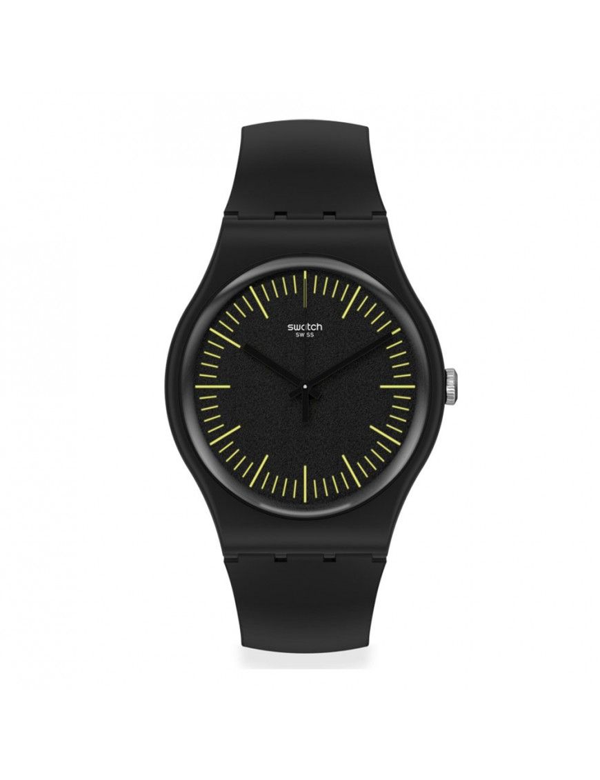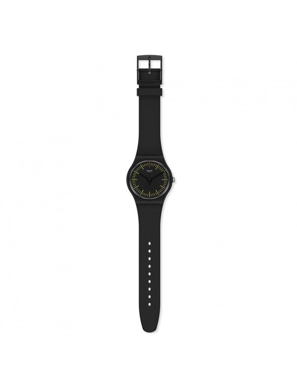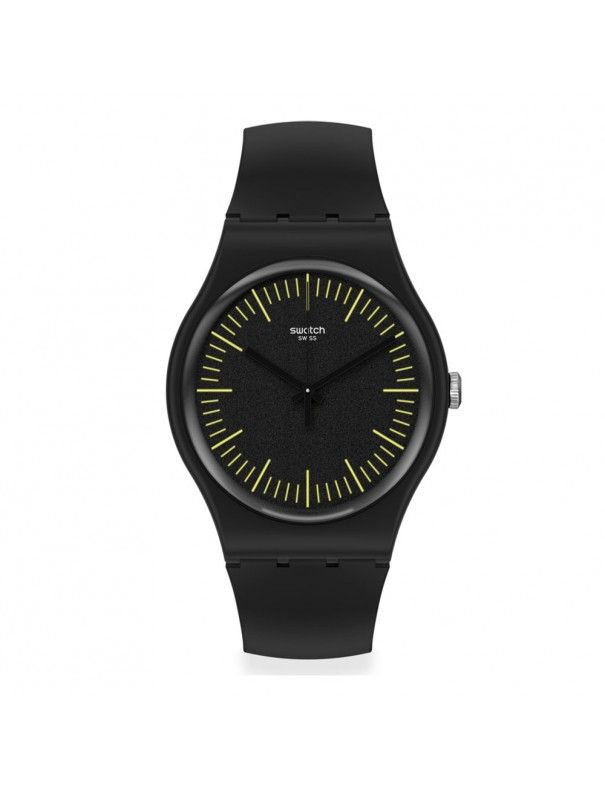 Reloj Swatch Blacknyellow SUOB184 Hombre, analógico con segundero. Caja de plástico de 41mm de diámetro y pulsera de caucho negro. Sumergible a 3ATM por lo que sólo soporta pequeñas salpicaduras.