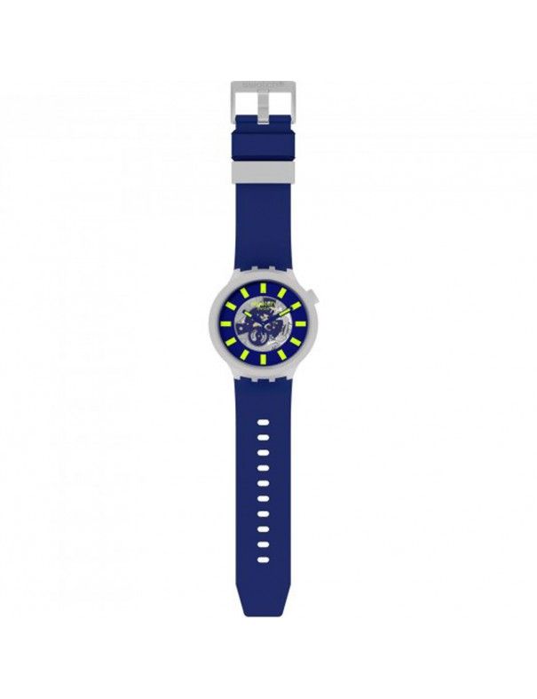 Reloj Swatch Bioceramic Limy SB03M103 (XL), analógico con segundero. Caja Bioceramic de 47mm de diámetro. Pulsera azul de orígen biológico.Sumergible a 3ATM, por lo que sólo soporta pequeñas salpicaduras.