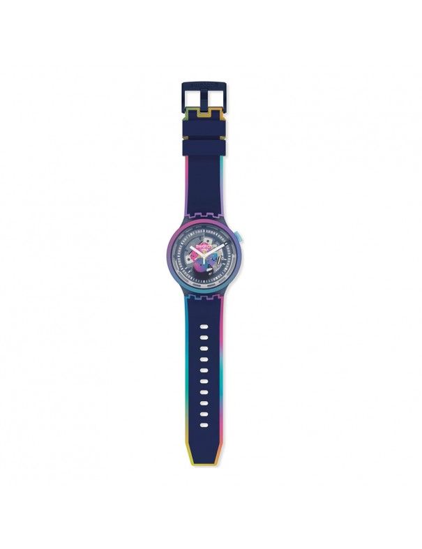 Reloj Swatch Rainbowinthenight Unisex SO27N112, analógico con segundero. Esfera de 47mm de diámetro. Caja de plástico. Pulsera de silicona. Sumergible a 3ATM, por lo que sólo soporta pequeñas salpicaduras.