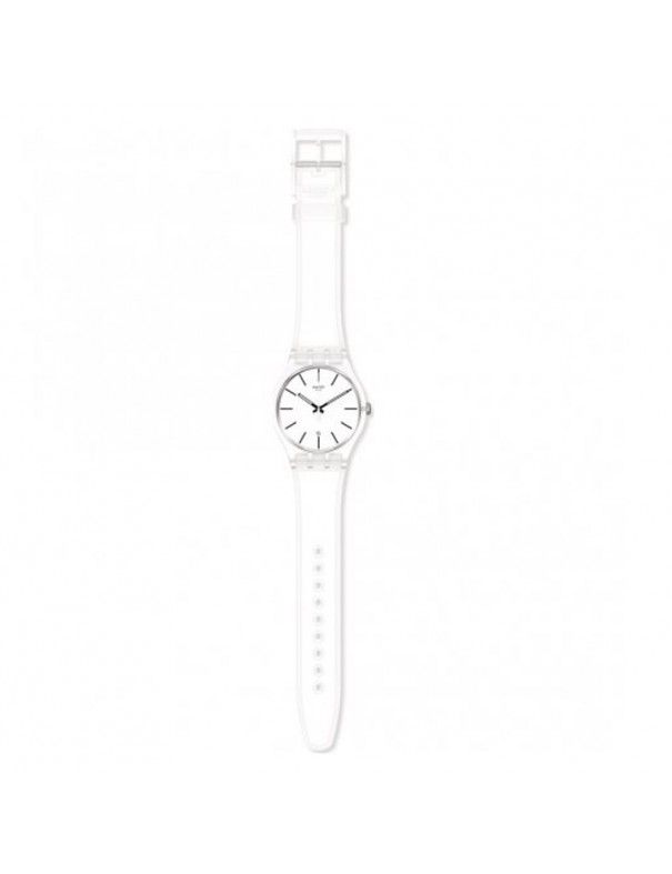 Reloj Swatch White Trip (L) SO29K401, analógico con segundero y ventana de calendario. Agujas luminiscentes. Caja de origen biológico. Pulsera de silicona blanca. Sumergible a 3ATM, por lo que sólo soporta pequeñas salpicaduras.