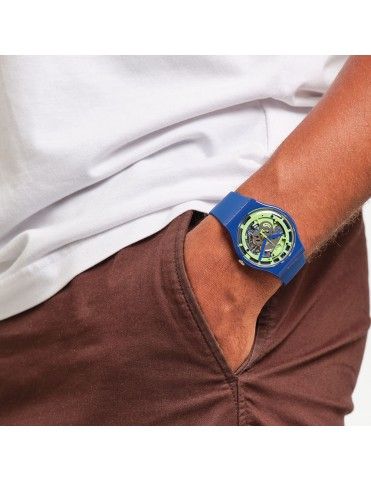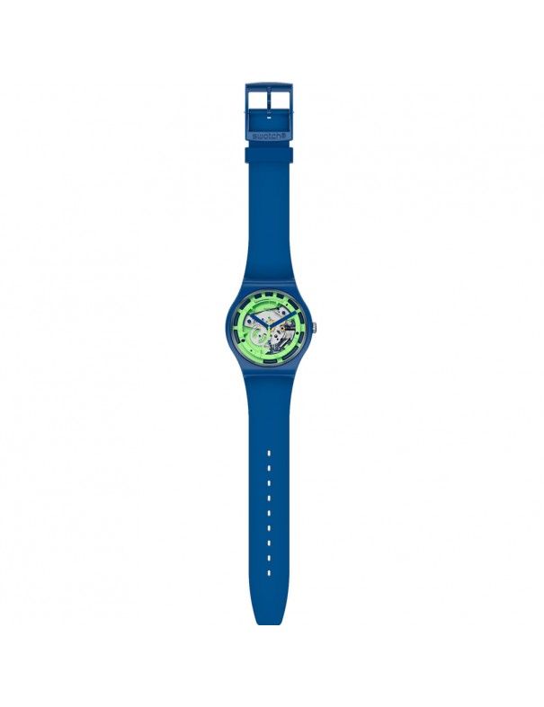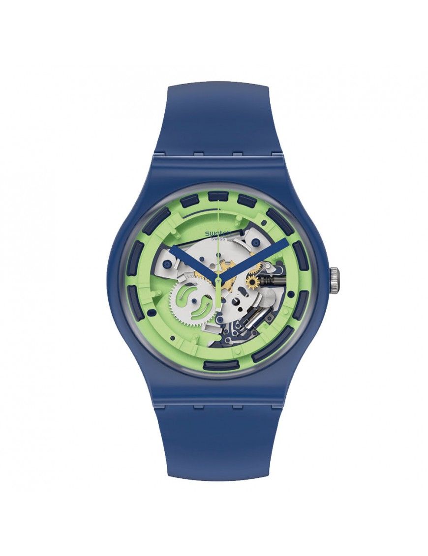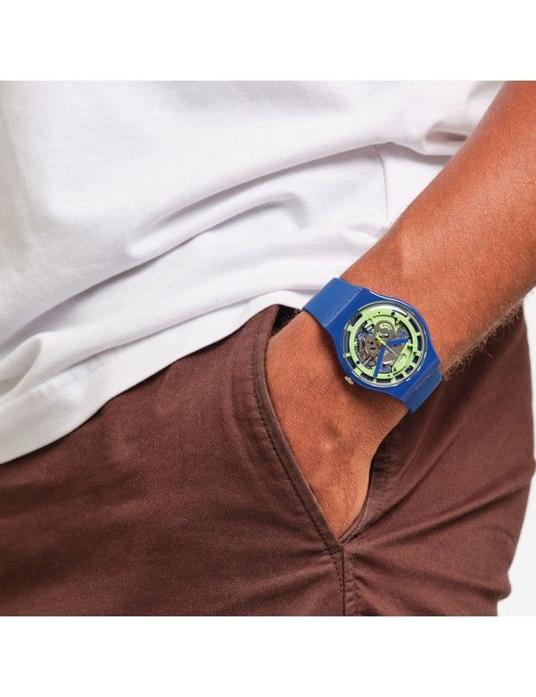 Reloj Swatch Green Anatomy (L) SUON147, analógico con segundero. Caja de plástico de 41mm de diámetro. Maquinaria a la vista. Pulsera de silicona. Sumergible a 3ATM, por lo que sólo soporta pequeñas salpicaduras.