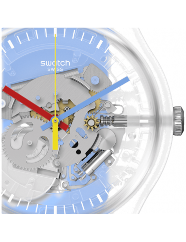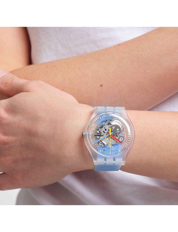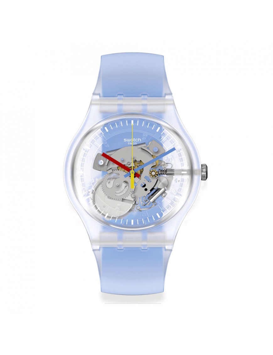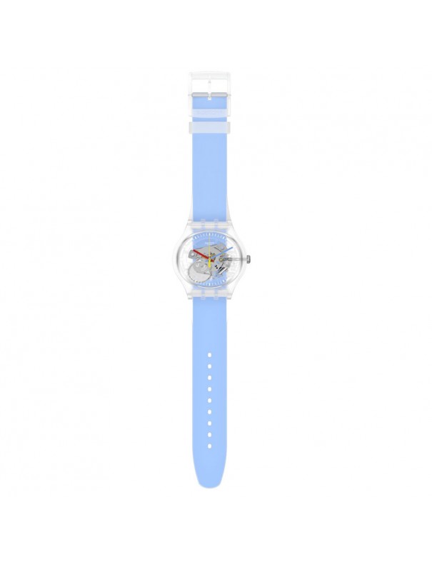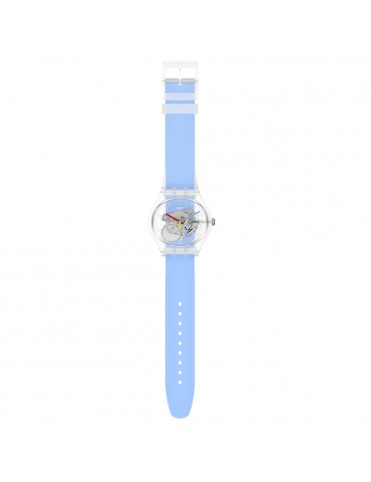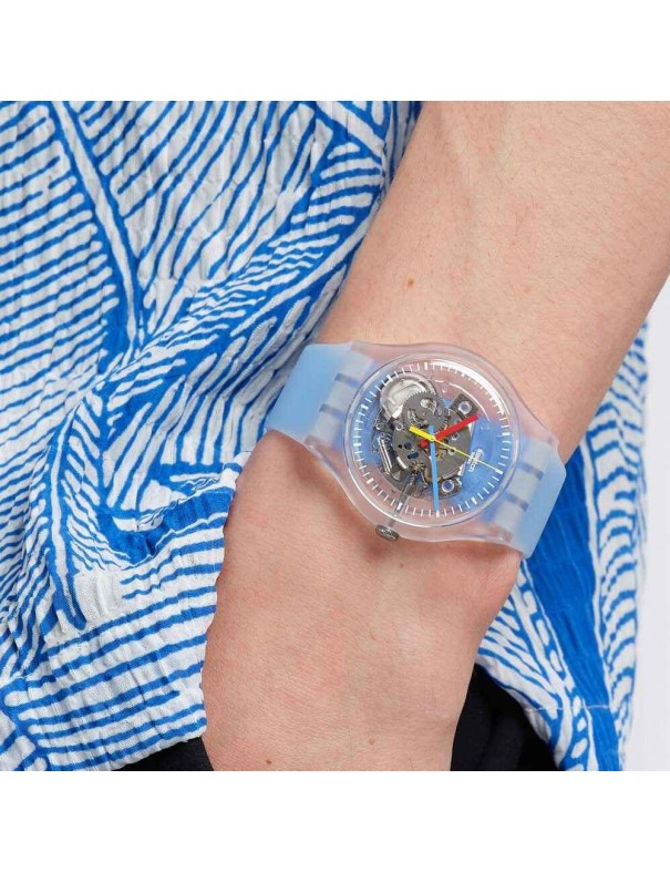Reloj Swatch Clearly Blue Striped SUOK156 (L), analógico de tres agujas. Caja de plástico de 41mm de diámetro. Pulsera de silicona. Sumergible a 3ATM, por loq ue sólo soporta pequeñas salpicaduras.