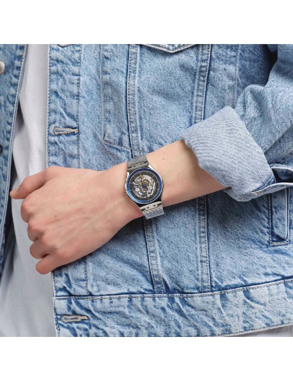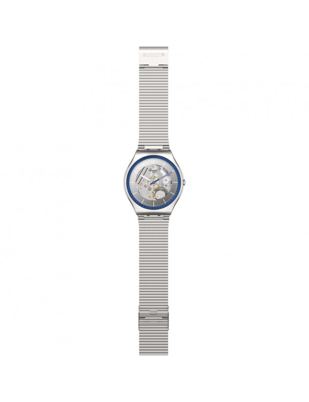 Reloj Swatch Ringing In Blue SS07S116GG (L), analógico de dos agujas. Caja de acero inoxidable de 42mm de diámetro. Pulsera de acero ajustable. Agujas luminiscentes. Maquinaria visible. Sumergible a 3ATM, por lo que sólo soporta pequeñas salpicaduras.