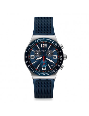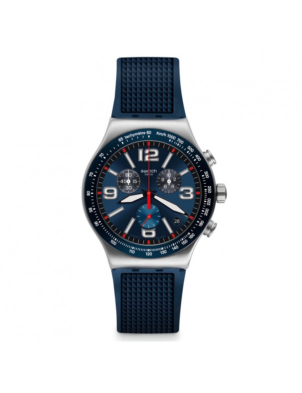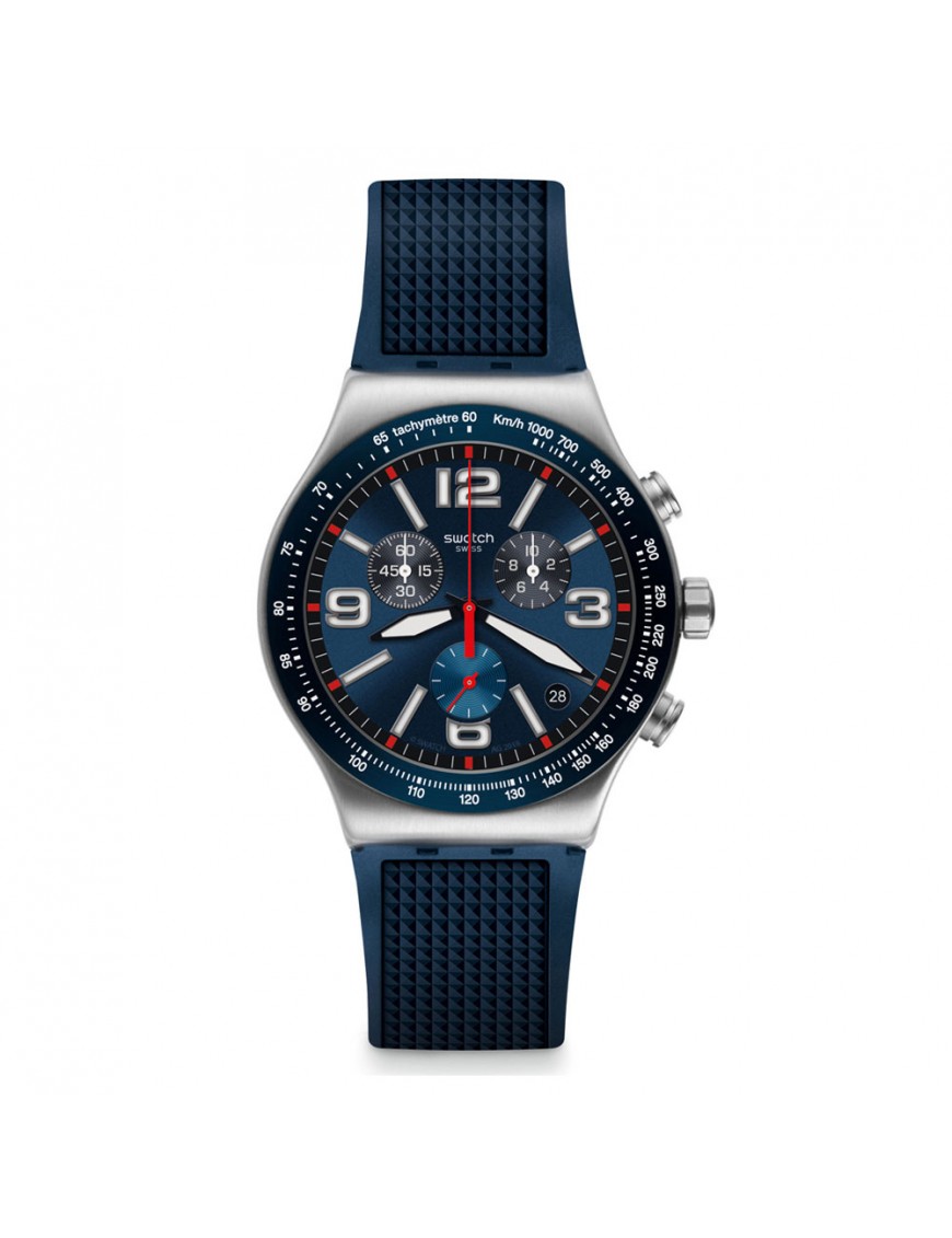 Reloj Swatch Blue Grid YVS545 (L), analógico crono. Caja de acero inoxidable de 43mm de diámetro. Pulsera de caucho y cierre de acero. Ventana de calendario. Agujas e indicadores luminiscentes. Cristal mineral. Sumergible a 3ATM, por lo que sólo soporta pequeñas salpicaduras.
