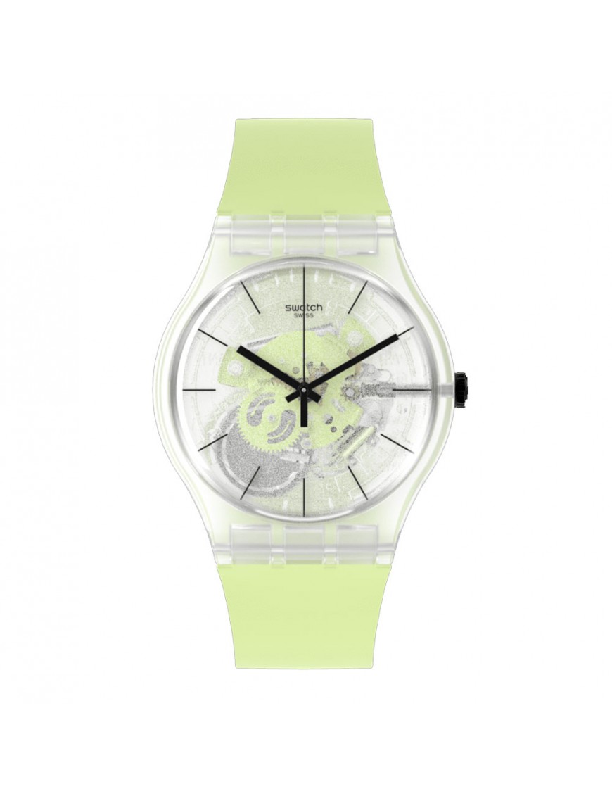 Reloj Swatch Green Daze(L) SO29K106, analógico de tres agujas. Maquinaria a la vista. Caja de material con origen biológico de 41mm de diámetro. Pulsera de silicona. Sumergible a 3ATM, por lo que sólo soporta pequeñas salpicaduras.