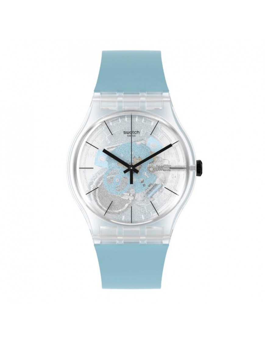 Reloj Swatch Blue Daze(L) SO29K105, analógico de tres agujas. Maquinaria a la vista. Caja de material con origen biológico de 41mm de diámetro. Pulsera de silicona. Sumergible a 3ATM, por lo que sólo soporta pequeñas salpicaduras.
