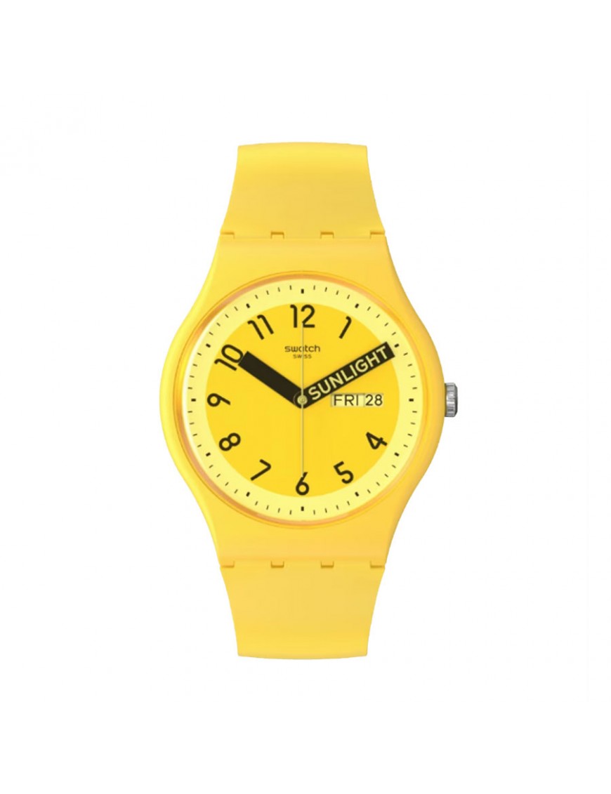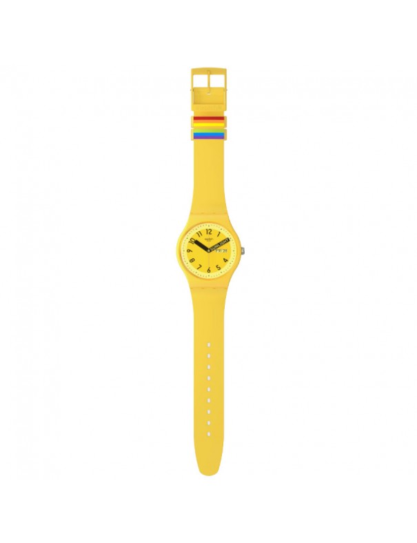 Reloj Swatch Proudly Yellow SO29J702 unisex. La esfera es de material de origen biológico y mide 41 mm de diámetro. La pulsera es de silicona y lleva hebilla de plástico.