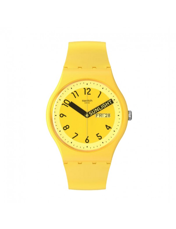 Reloj Swatch Proudly Yellow SO29J702 unisex. La esfera es de material de origen biológico y mide 41 mm de diámetro. La pulsera es de silicona y lleva hebilla de plástico. Garantía de tres años.