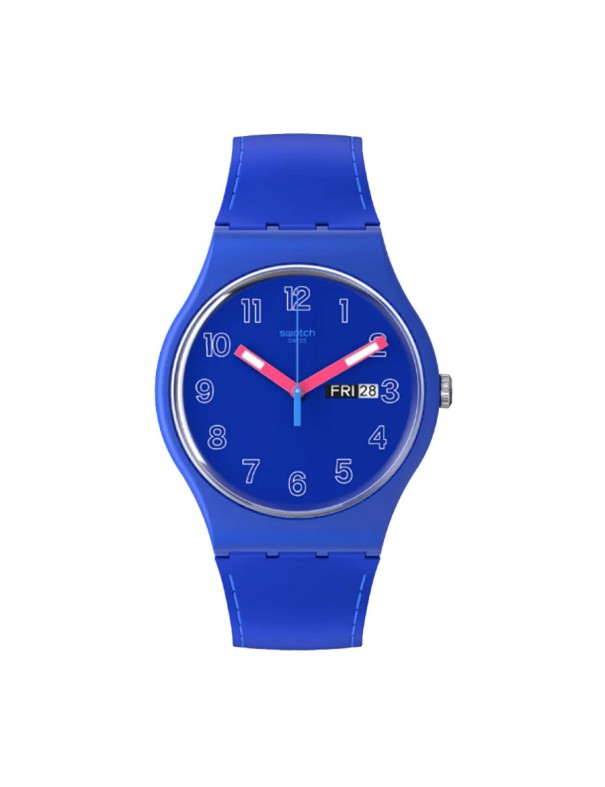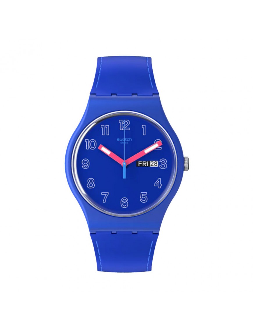 Reloj Swatch Cobalt Disco SO29N705 unisex. La esfera es de material de origen biológico y mide 41 mm de diámetro. La pulsera es de silicona con hebilla de plástico. Garantía de tres años.