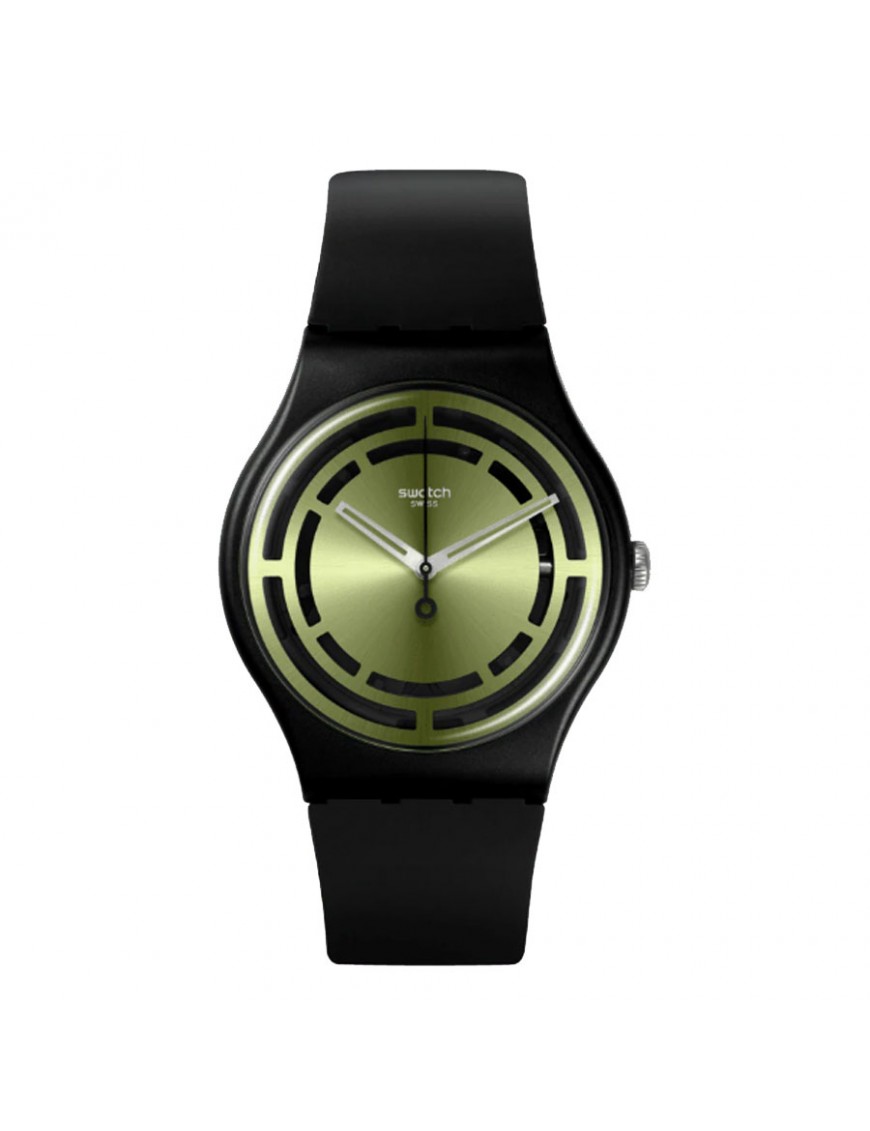 Reloj Swatch Leafy Line SO32B117 unisex. La esfera es de material biocerámico y mide 41 mm de diámetro. La pulsera es de silicona con hebilla de plástico. No es sumergible (3ATM) y sólo admite leves salpicaduras. Garantía de tres años.