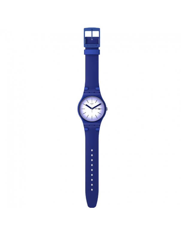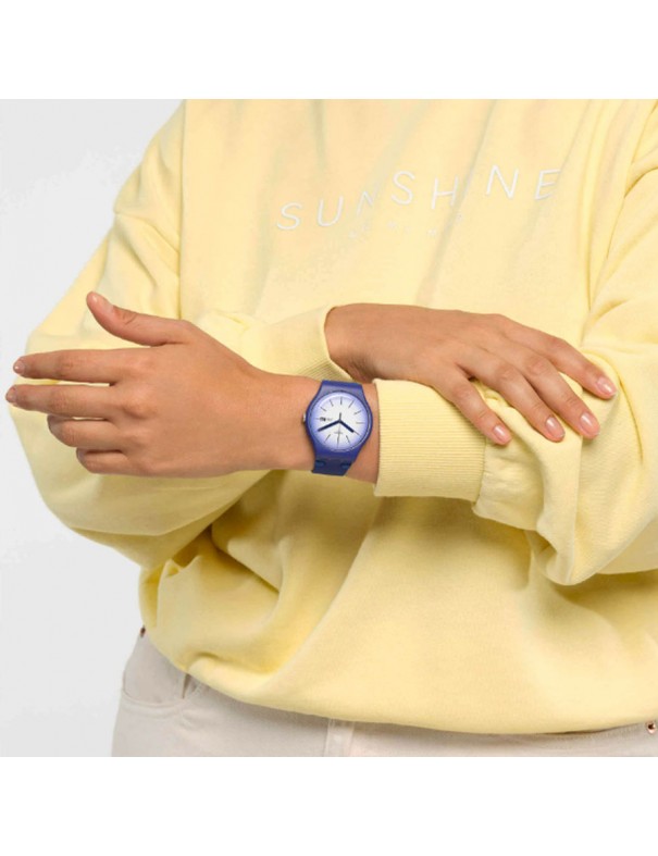 Reloj Swatch Violet Verbena SUON716 unisex. La esfera es de plástico y mide 41 mm de diámetro. La pulsera es de silicona con hebilla de plástico. No es sumergible (3ATM) y sólo admite leves salpicaduras. Garantía de tres años.