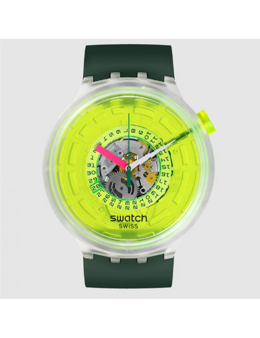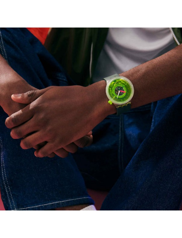 Reloj Swatch Blinded In Neon SB05K400 unisex. La esfera es de material de origen biológico y mide 47 mm de diámetro. La pulsera es del mismo material con cierre de aluminio. No es sumergible (3ATM) y sólo admite leves salpicaduras. Garantías de 3 años.