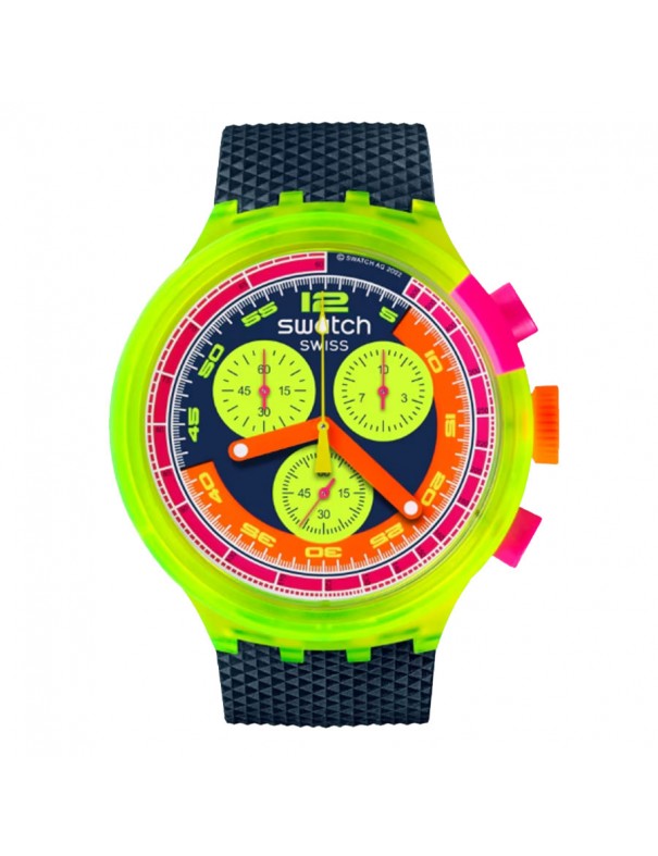 Reloj Swatch Neon To The Max SB06J100 unisex. La caja es de material de origen biológico y mide 47 mm de diámetro. La pulsera y la hebilla son del mismo material. No es sumergible (3ATM) y sólo admite leves salpicaduras. Garantía de tres años.
