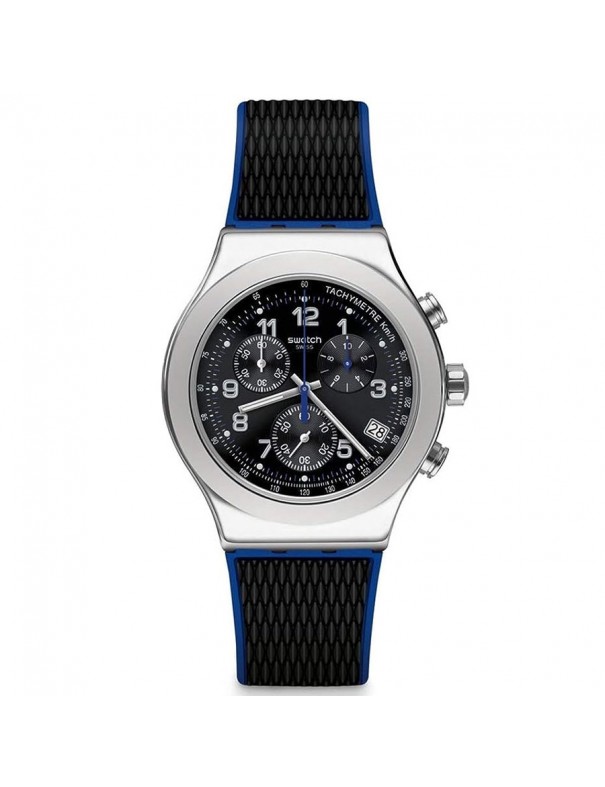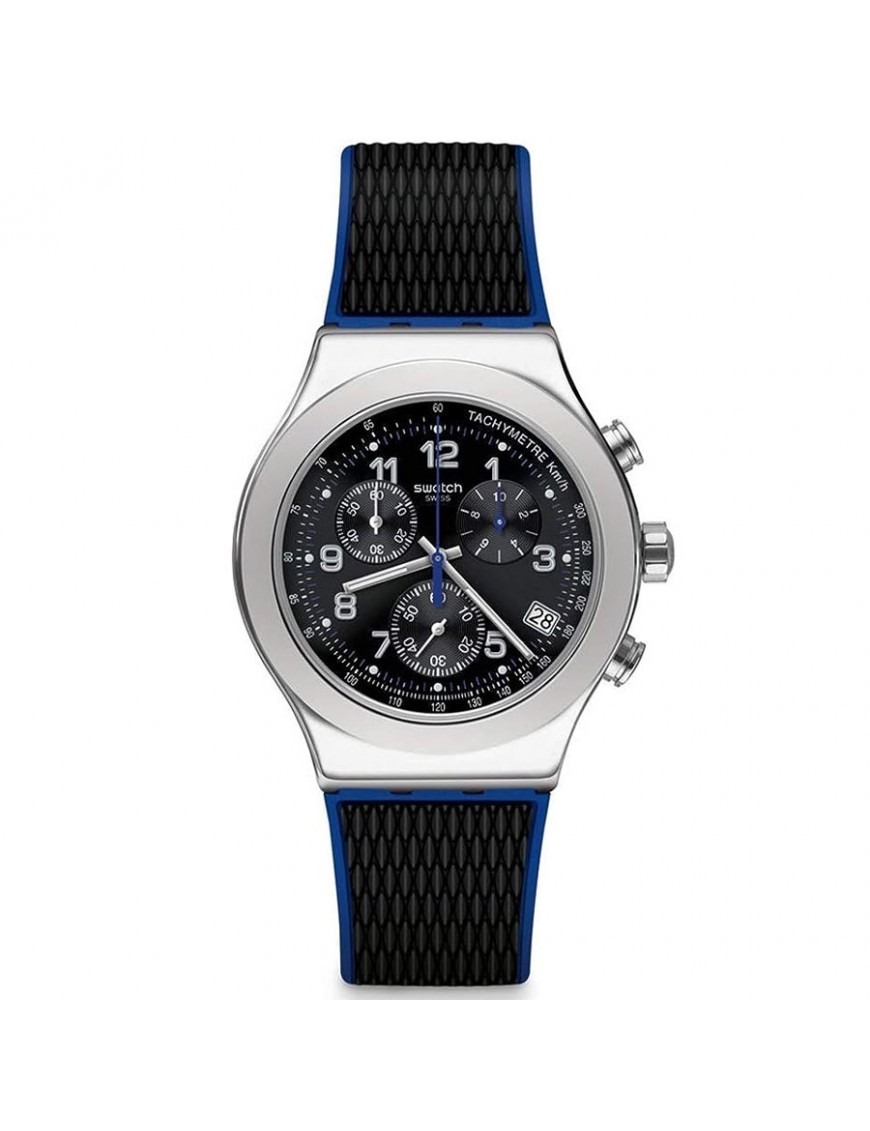 Reloj Swatch Irony Secret Mission YVS451 para hombre. La esfera es de acero y mide 43 mm de diámetro. La pulsera es de caucho con hebilla. Incluye función cronógrafo y calendario. No es sumergible (3ATM) y sólo admite leves salpicaduras. Garantía de tres años.