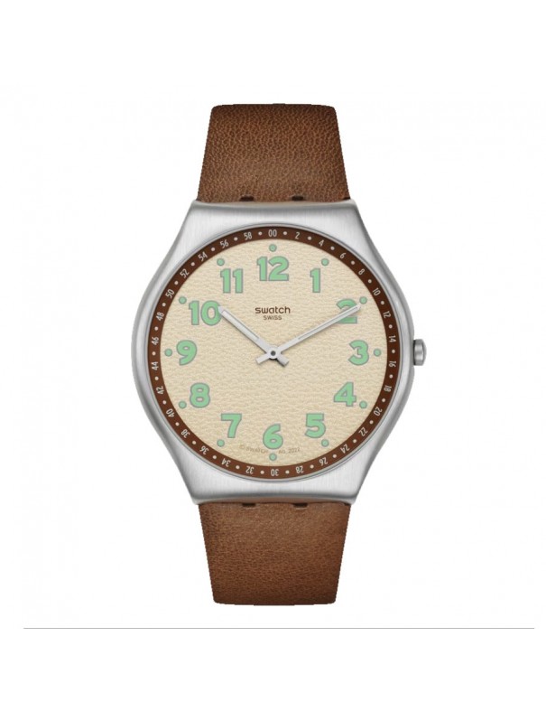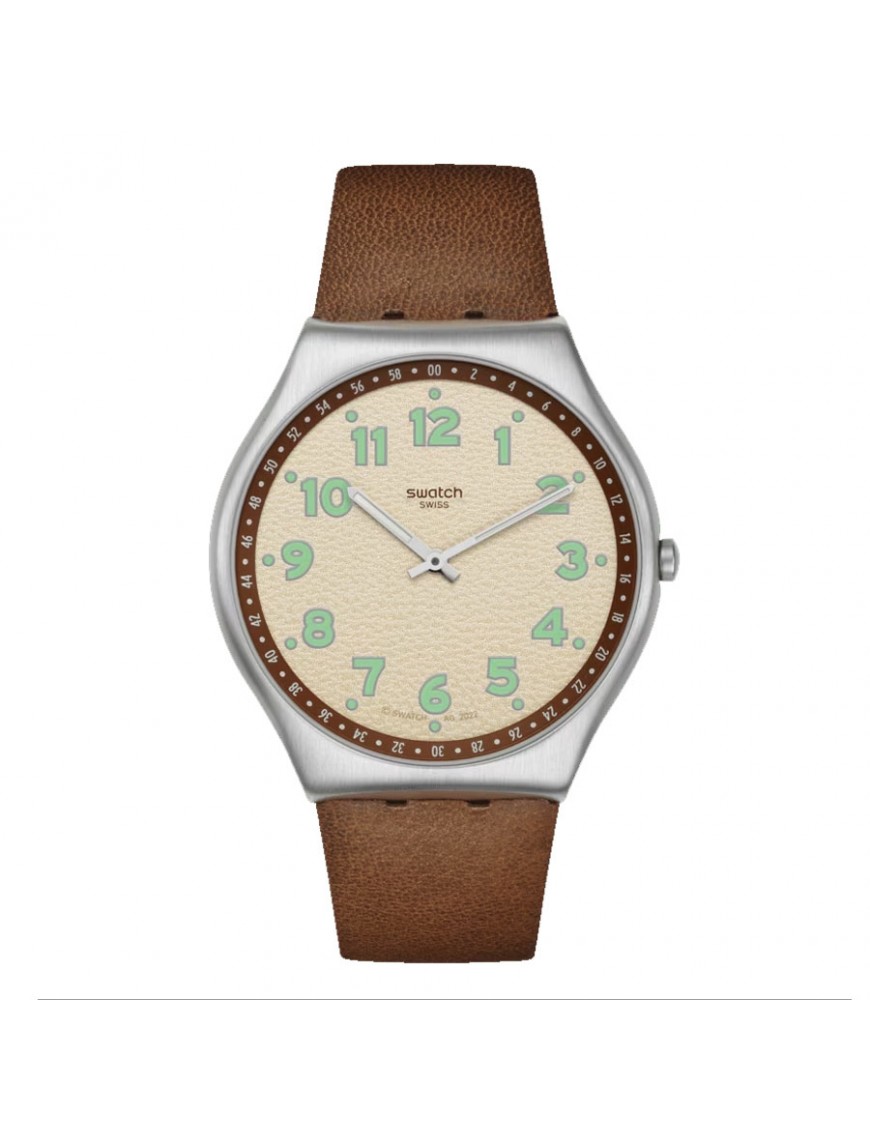 Reloj Swatch Tabby Hepcat SS07S135 para hombre. La esfera es de acero, mide 42 mm de diámetro y es ultrafina. La pulsera es de piel con hebilla de acero. No es sumergible (3ATM) y sólo admite leves salpicaduras. Garantía de tres años.
