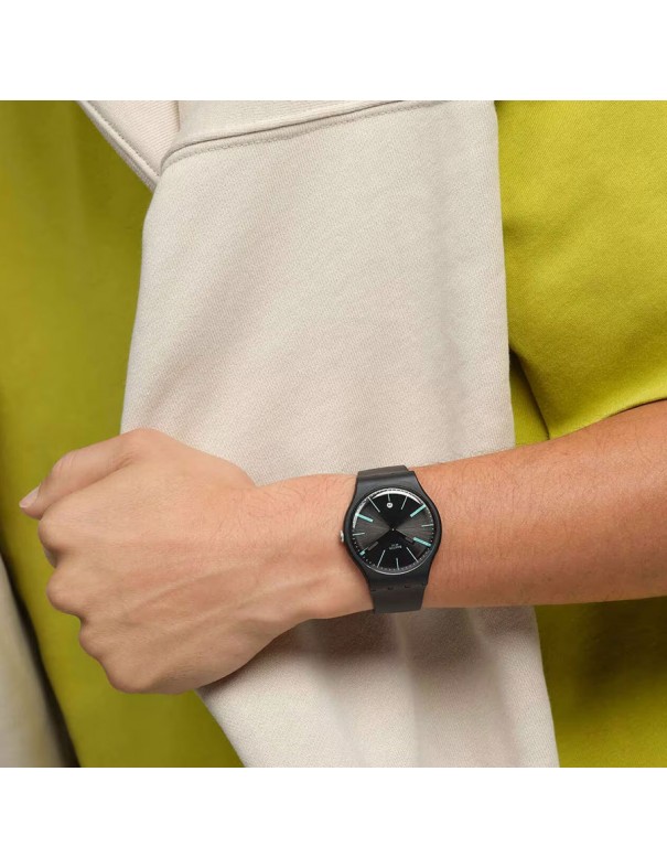 Reloj Swatch A Dash Of Green para hombre SO29B404. La esfera es de material de origen biológico y mide 41 mm de diámetro. La pusiera es del mismo material con hebilla de plástico. No es sumergible (3ATM) y tiene tres años de garantía.