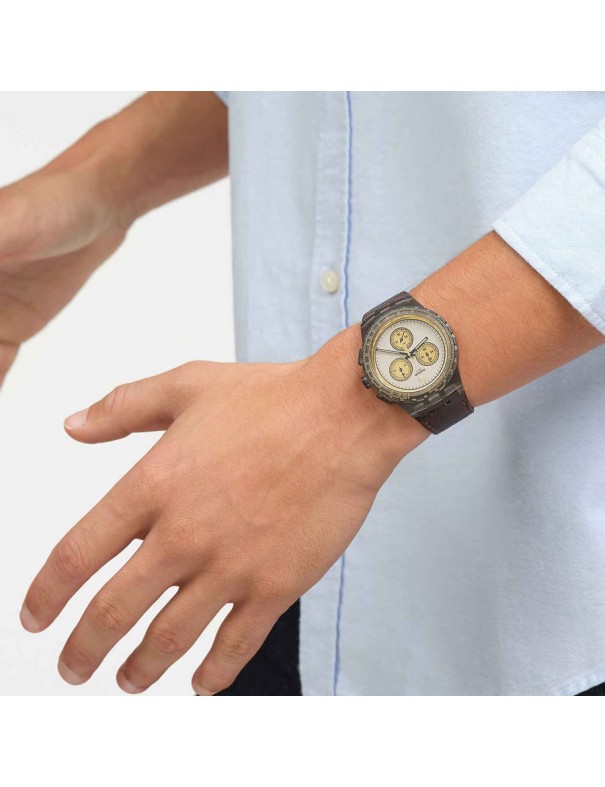 Reloj Swatch Golden Radiance para hombre SUSM100. la esfera es de plástico y mide 42 mm de diámetro. La pulsera es de piel con hebilla de plástico. Incluye función cronógrafo. No es sumergible (3ATM) y tiene tres años de garantía.
