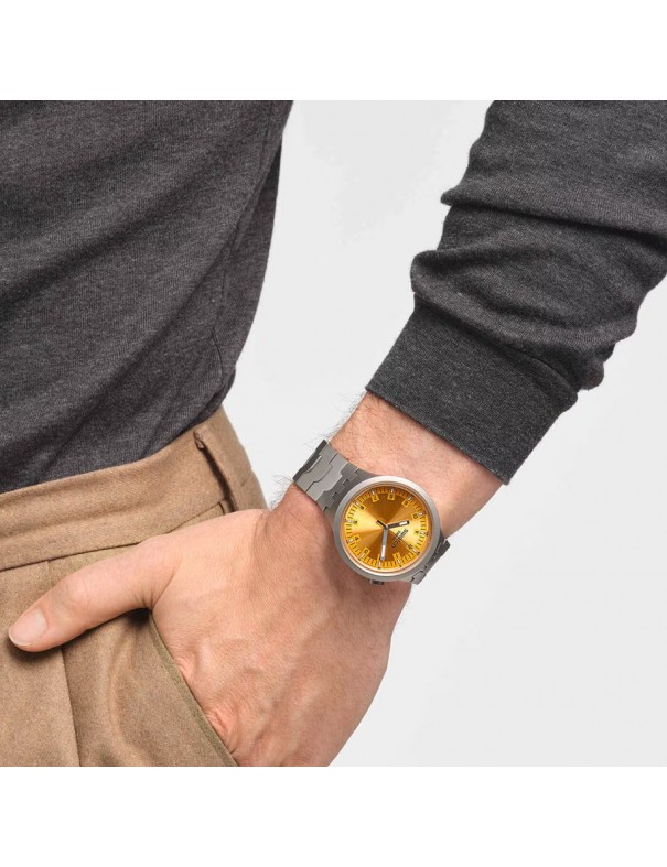 Reloj Swatch Amber Sheen de acero SB07S103G. La caja es de acero y mide 47 mm de diámetro. La pulsera es de acero y lleva cierre de mariposa. No es sumergible (3ATM) y tiene tres años de garantía.