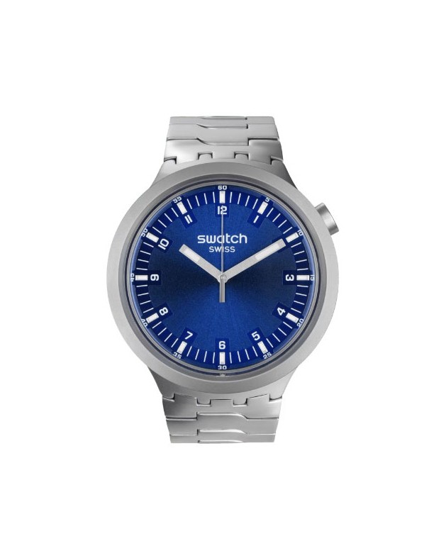 Reloj Swatch Indigo Hour SB07S102G (XL), analógico de tres agujas. Caja de acero de 47mm de diámetro. Agujas e indicadores luminiscentes. Correa de acero. Sumergible a 3 ATM, por lo que sólo soporta pequeñas salpicaduras.
