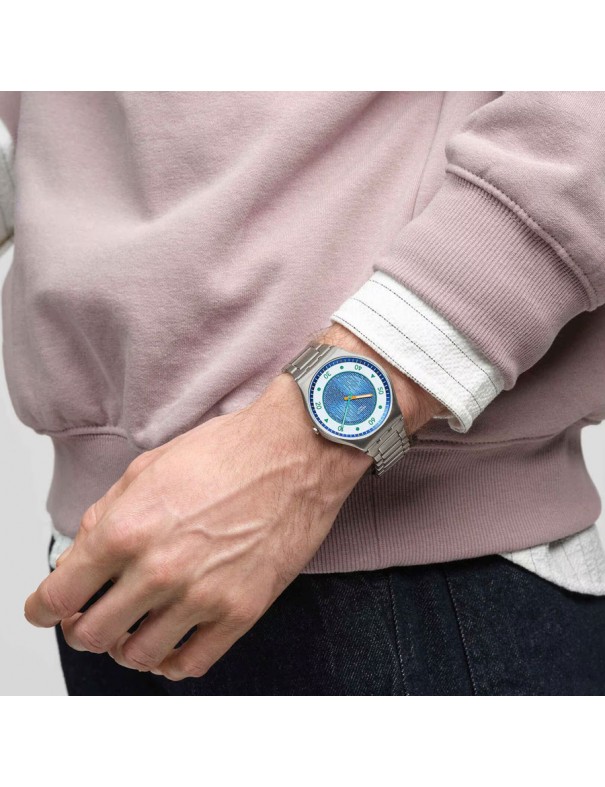 Reloj Swatch Splash Dance para hombre SS07S143G. La caja es extraplana de acero y mide 42 mm de diámetro. La pulsera es del mismo material con cierre mariposa. No es sumergible (3ATM) y cuenta con tres años de garantía.