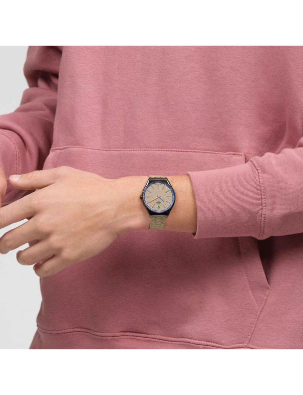 Reloj Swatch Sunbaked Sandstone para hombre SYXM100. La caja es de acero inoxidable y mide 38 mm de diámetro. La pulsera es de textil y piel y lleva hebilla de acero. No es sumergible (3ATM) y tiene tres años de garantía.