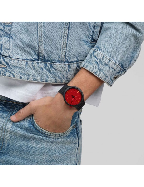 Reloj Swatch Midnight Mode Big Bold SB05B111. La caja es de material de origen biológico al igual que la pulsera y mide 47 mm de diámetro. La hebilla es de aluminio. No es sumergible (3ATM) y tiene tres años de garantía.