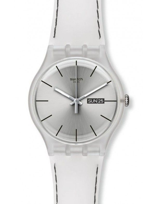 Reloj Swatch unisex Resolution SUOK700C. Este reloj con calendario es de la línea de relojes Originals New Gent. La caja que contiene el mecanismo es de plástico traslucido, y tiene un diámetro de 41mm. La correa es de silicona blanca con detalles en color negro. El reloj es sumergible a 3 ATM y tiene una garantía de 2 años.