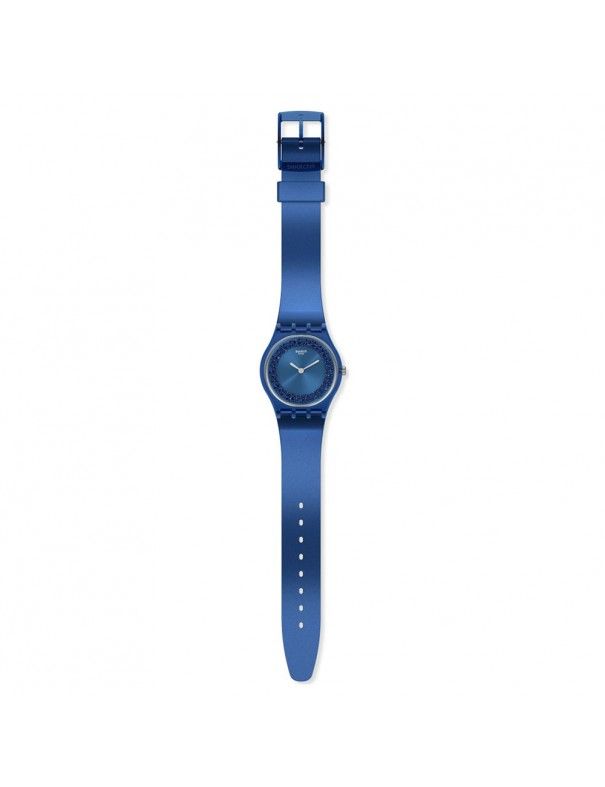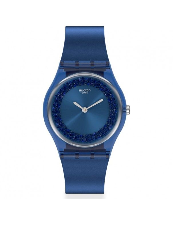 Reloj Swatch Sideral GN169 Mujer, analógico con caja de 34mm de diámetro, agujas blancas y esfera bordeada por circonitas azules. Pulsera de caucho azul. Sumergible a 3ATM, por lo que sólo soporta pequeñas salpicaduras. Garantía de dos años contra defectos de fabricación.