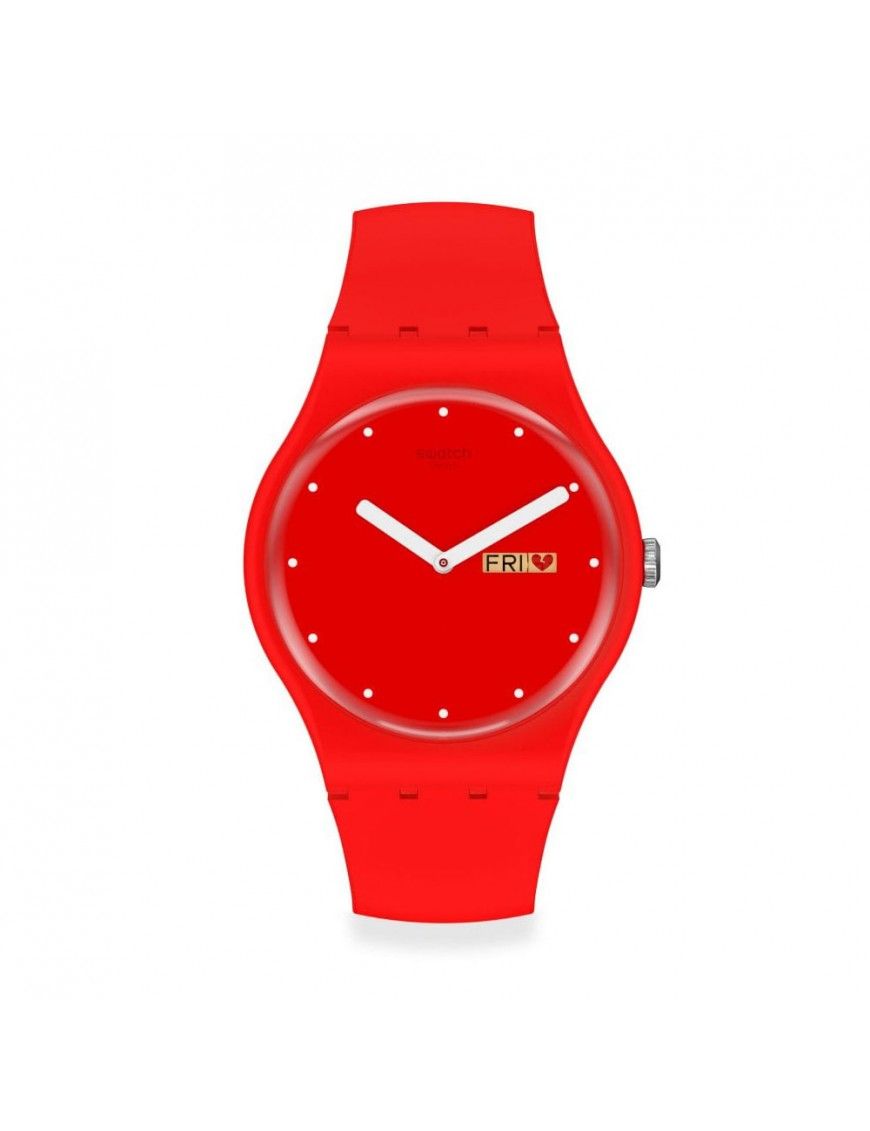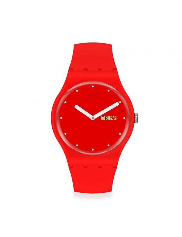 Reloj Swatch P(E/A)NSE-MOI SUOZ718, analógico con ventana de calendario. Caja de plástico de 41mm de diámetro y pulsera de caucho rojo. Sumergible a 3ATM, por lo que sólo soporta pequeñas salpicaduras.