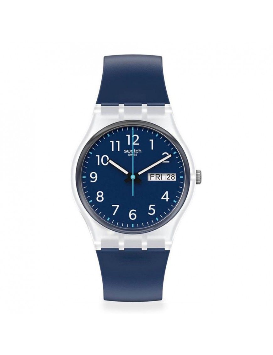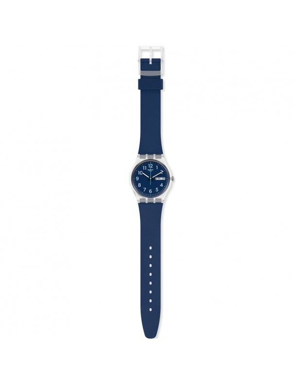 Reloj Swatch Rinse Repeat Navy GE725 (M), analógico son segundero. Esfera de 34mm de diámetro y agujas luminiscentes. Ventana de calendario (día de la semana y del mes). Pulsera azul de material con origen biológico. Sumergible a 3ATM, por lo que sólo soporta pequeñas salpicaduras.