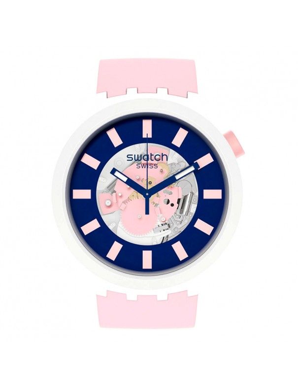 Reloj Swatch Bioceramic Diversipink SB03M105 (XL), analógico con segundero. Caja Bioceramic de 47mm de diámetro. Pulsera rosa de origen biológico. Sumergible a 3ATM, por lo que sólo soporta pequeñas salpicaduras.