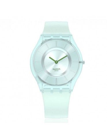 Reloj Swatch Skin Sweet Mint SS08G100 (M), analógico sin segundero. Caja de origen biológico de 34mm de diámetro. Pulsera de silicona de color verde turquesa. Sumergible a 3ATM, por lo que sólo soporta pequeñas salpicaduras.