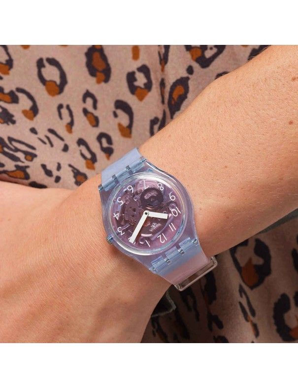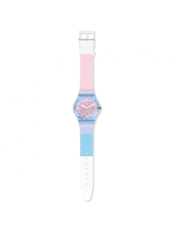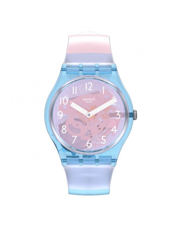 Reloj Swatch Pinkzure GL126 (M), analógico sin segundero. Caja de 34mm de diámetro. Pulsera de plástico. Sumergible a 3ATM, por lo que sólo soporta pequeñas salpicaduras.