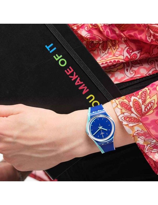 Reloj Swatch Blue Store (M) GW217, analógico con segundero. Caja de plástico de 34mm de diámetro. Pulsera de silicona azul con líneas turquesas. Sumergible a 3ATM, por lo que sólo soporta pequeñas salpicaduras.