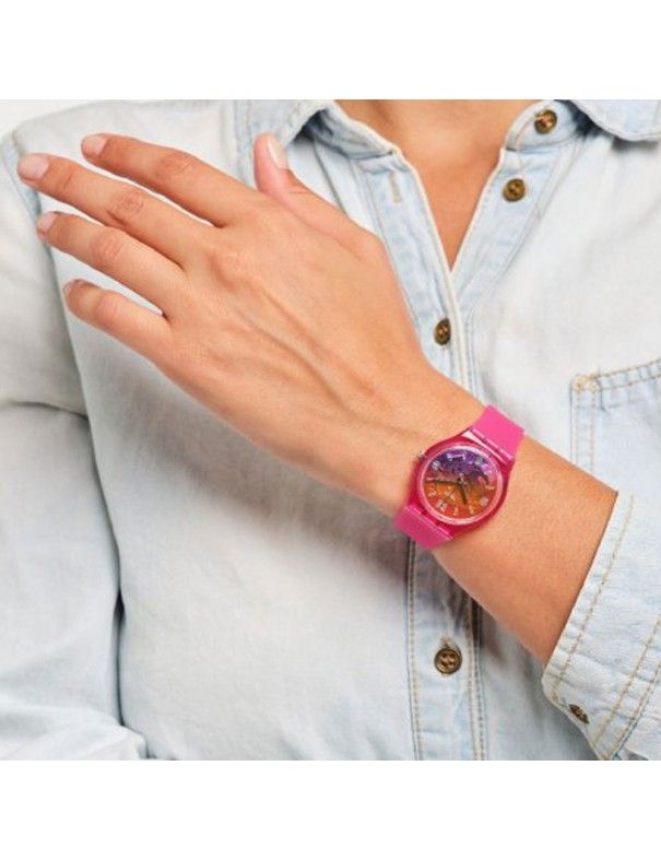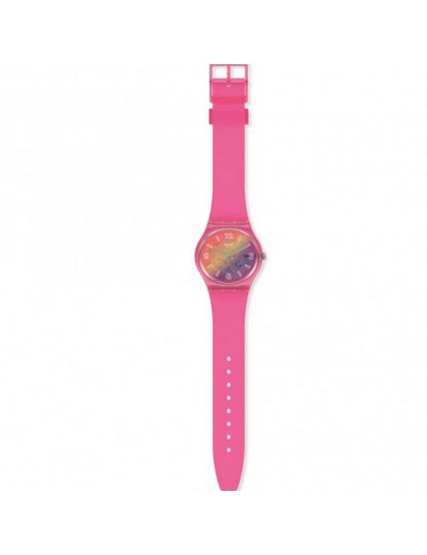 Reloj Swatch Orange Disco Fever (M) GP174, analógico con segundero. Caja de plástico de 34mm de diámetro. Pulsera de silicona. Maquinaria a la vista. Sumergible a 3ATM, por lo que sólo soporta pequeñas salpicaduras.