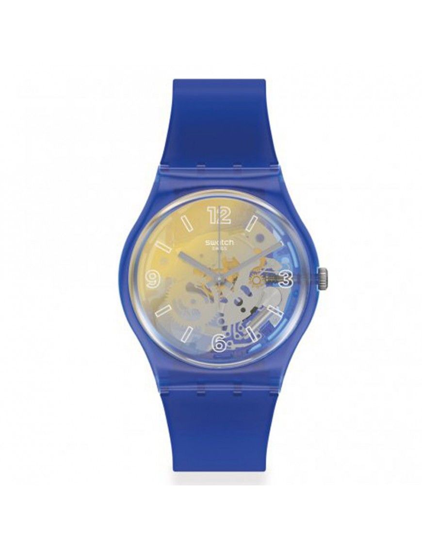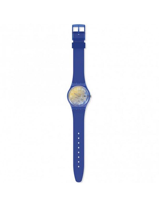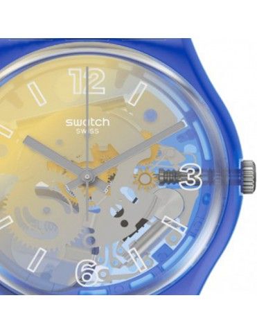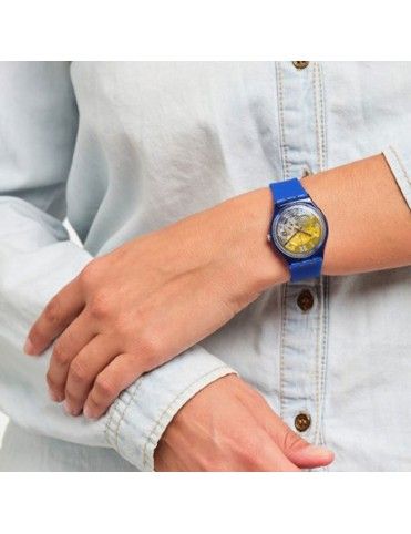 Reloj Swatch Yellow Disco Fever (M) GN278, analógico con segundero. Caja de plástico de 34mm de diámetro. Pulsera de silicona. Maquinaria a la vista. Sumergible a 3ATM, por lo que sólo soporta pequeñas salpicaduras.