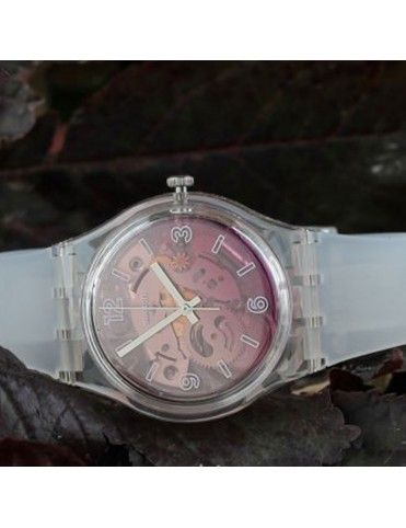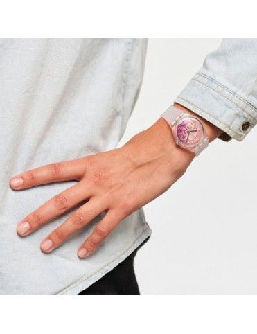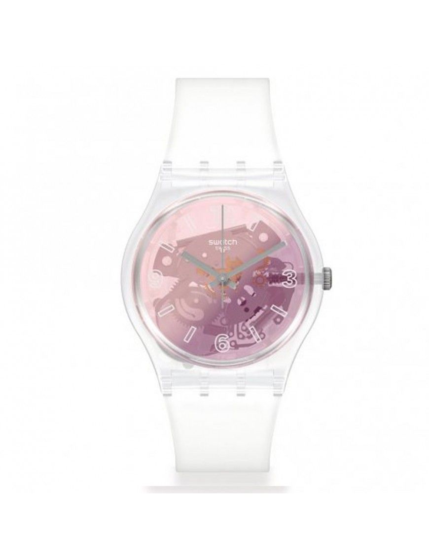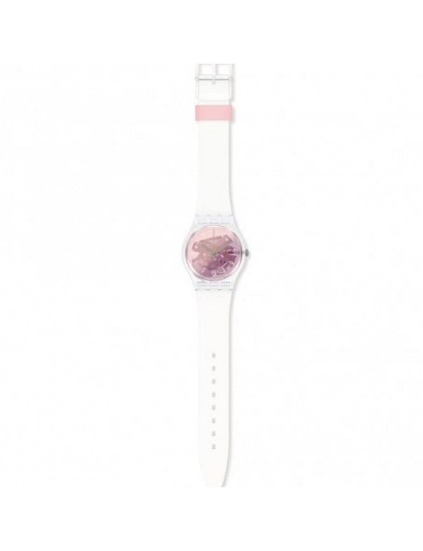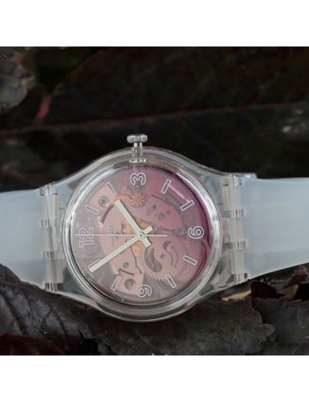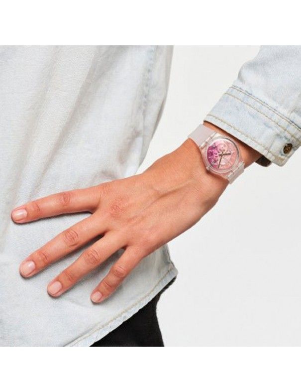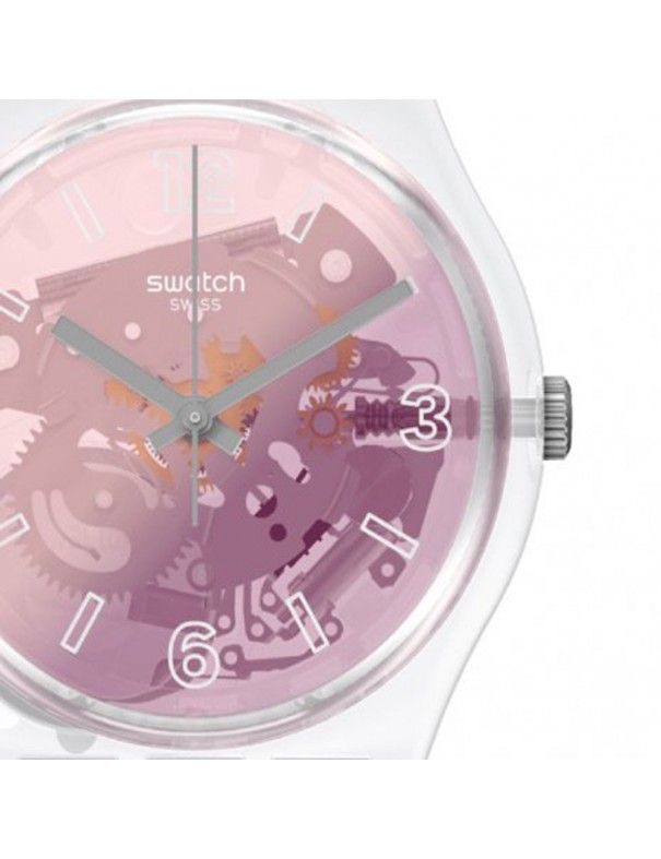 Reloj Swatch Pink Disco Fever (M) GE290, anañógico con segundero. Caja de plástico de 34mm de diámetro. Pulsera de silicona. Maquinaria a la vista. Sumergible a 3ATM, por lo que sólo soporta pequeñas salpicaduras.