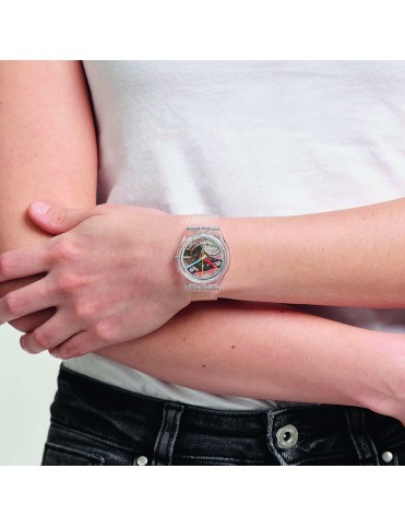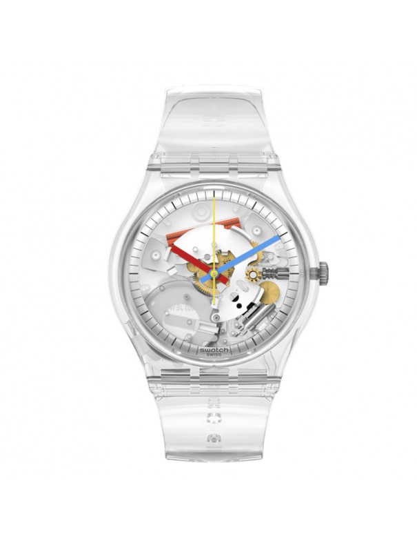 Reloj Swatch Clearly New Gent SO29K100 (L), analógico de tres agujas. Caja de plástico de 41mm de diámetro. Pulsera de plástico. Maquinaria visible. Sumergible a 3ATM, por lo que sólo soporta pequeñas salpicaduras.