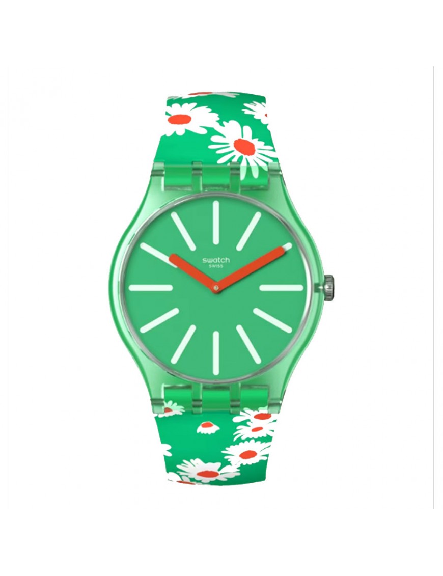 Reloj Swatch Meadow Flowers SO29G104 unisex. La esfera mide 41 mm de diámetro y es de material de origen biológico. La pulsera es de silicona con hebilla de plástico. Garantía de tres años.