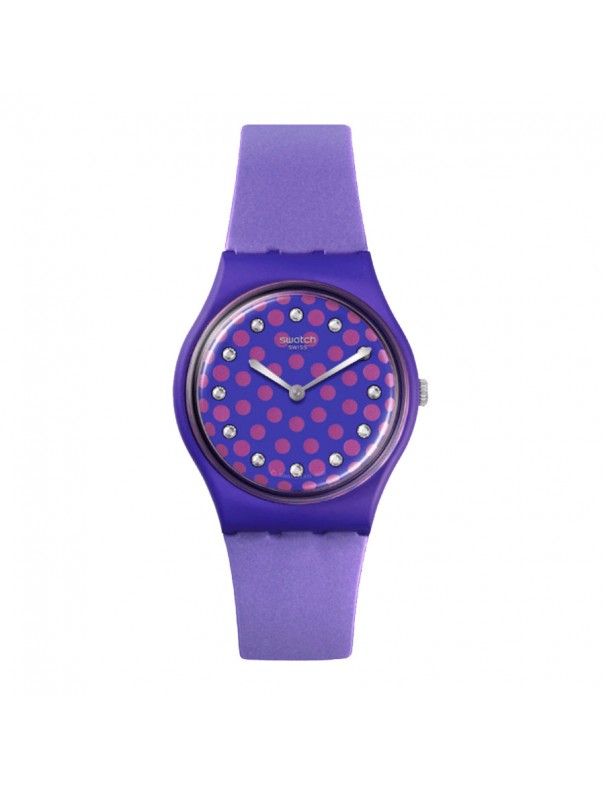 Reloj Swatch Perfect Plum SO31V100 unisex. La esfera es de material biocerámico y mide 34 mm de diámetro. La pulsera es de silicona con hebilla de plástico. No es sumergible (3ATM) y admite sólo leves salpicaduras. Garantía de tres años.