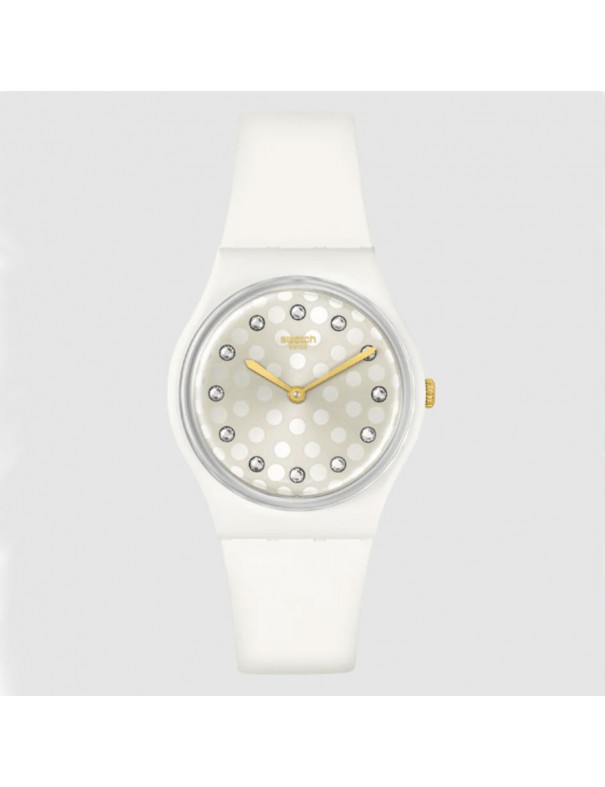 Reloj Swatch Sparkle Shine SO31W109 unisex. La esfera es de material biocerámico y mide 34 mm de diámetro. La pulsera es de silicona con hebilla de plástico. No es sumergible (3ATM) y sólo admite leves salpicaduras. Garantía de tres años.