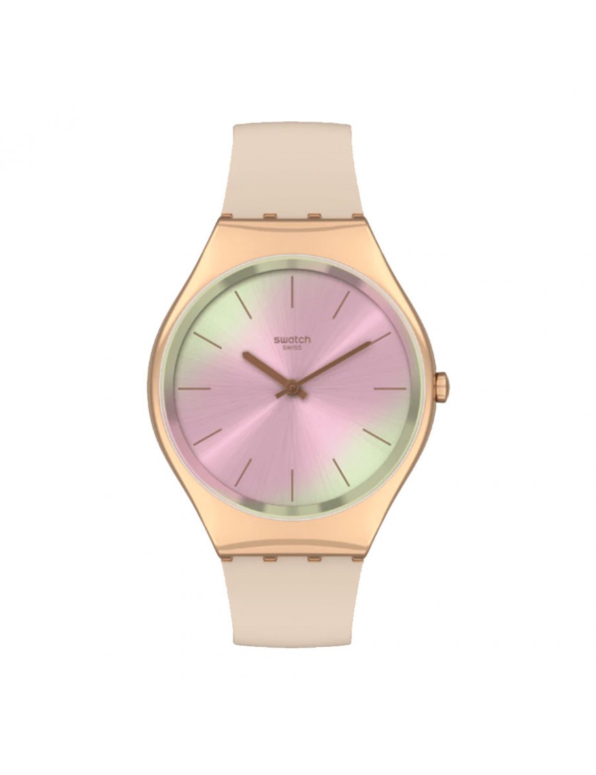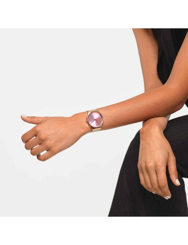 Reloj Swatch Desert Mirage SYXG122 unisex. La esfera es de acero inoxidable y mide 38 m de diámetro. La pulsera es de silicona con hebilla de acero inoxidable. No es sumergible (3ATM) y sólo admite leves salpicaduras. Garantía de tres años.