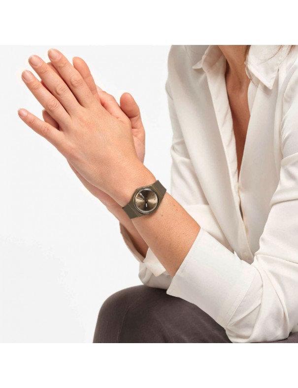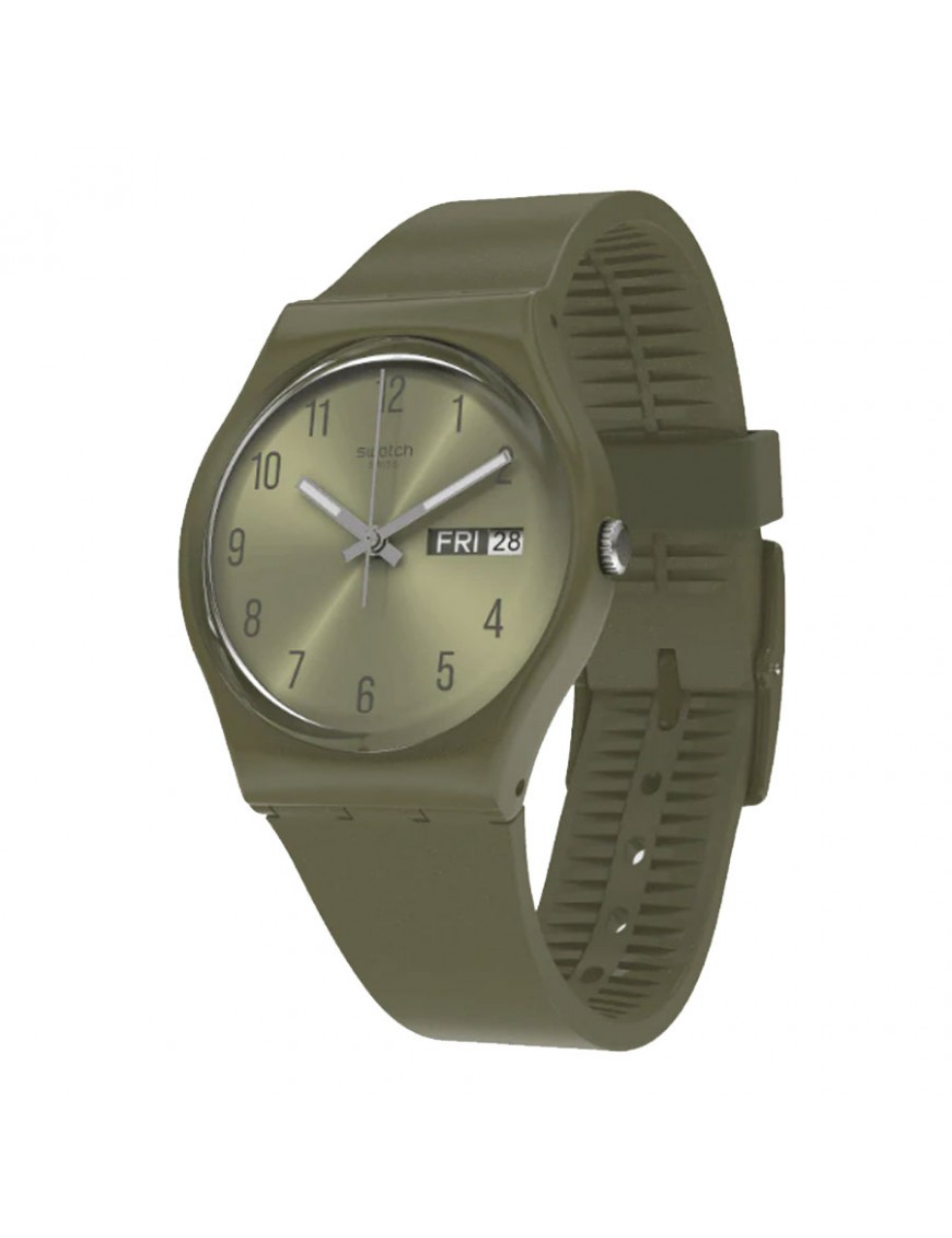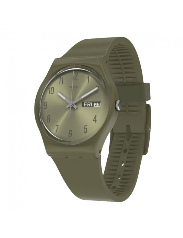 Reloj Swatch Pearlygreen GG712 unisex. La esfera es de plástico y mide 34 mm. La pulsera es de silicona y lleva hebilla de plástico. No es sumergible (3ATM) y sólo admite leves salpicaduras. Garantía de 3 años.