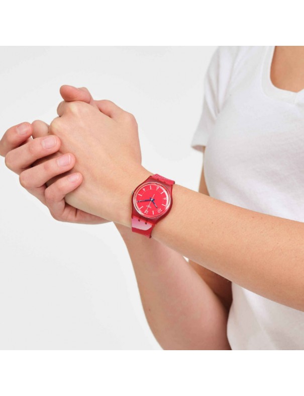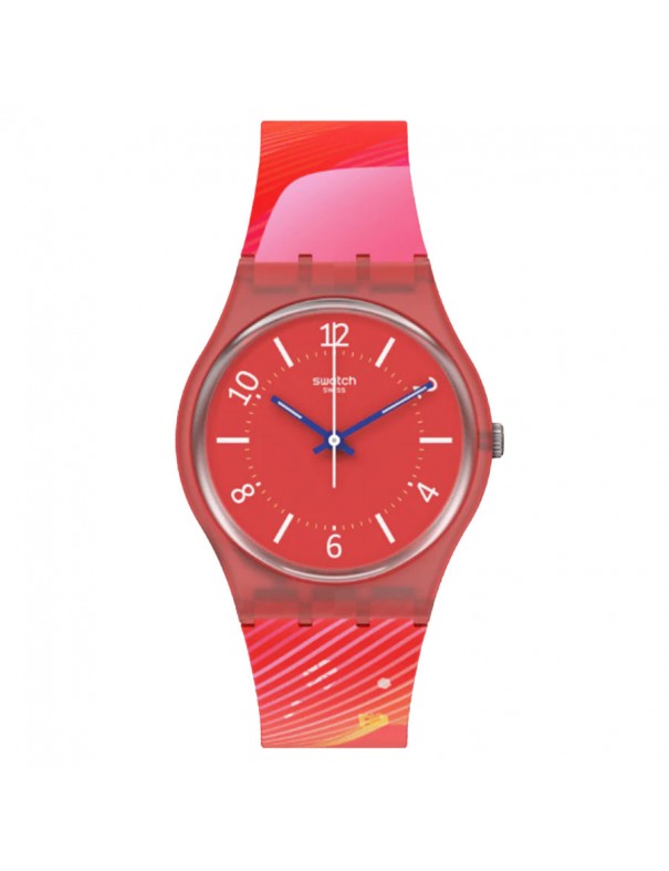 Reloj Swatch Charm Of Calligraphy SO28Z105 para mujer. La esfera es de material de origen biológico y mide 34 mm de diámetro. La pulsera es de silicona con hebilla de plástico. No es sumergible (3ATM) y sólo admite leves salpicaduras. Garantía de tres años.