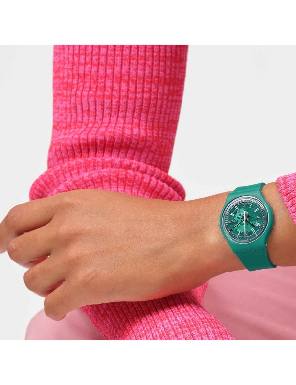 Reloj Swatch Photonic Turquois para mujer SO28G108. la esfera es de material de origen biológico de 34 mm de diámetro. La pulsera es de silicona con hebilla de origen biológico. No es sumergible (3ATM) y tiene tres años de garantía.