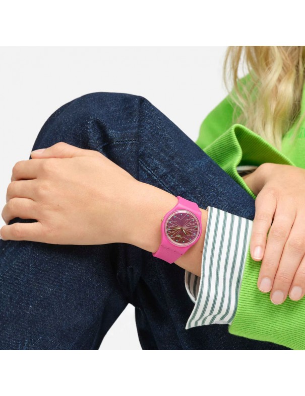Reloj Swatch Fantastic Fuchsia SO28P110. la saja es de material de origen biológico y mide 34 mm de diámetro. La pulsera es de silicona con hebilla de plástico. No es sumergible (3ATM) y tiene tres años de garantía.