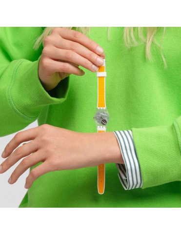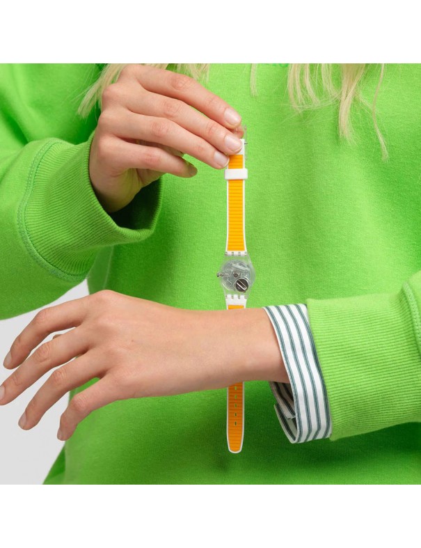 Reloj Swatch The Gold Within You para mujer LE108. La caja y la hebilla son de plástico y mide 25 mm de diámetro de esfera. La pulsera es de silicona. No es sumergible (3ATM) y tiene tres años de garantía.