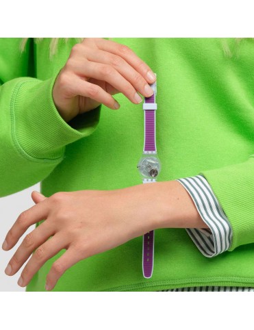 Reloj Swatch Powder Plum para mujer LL126. La caja es de plástico y mide 25 mm de diámetro. la pulsera es de silicona con hebillas de plástico. No es sumergible (3ATM) y cuenta con tres años de garantía.