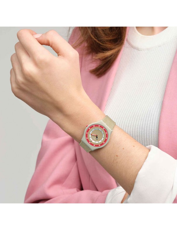 Reloj Swatch Coral Dunes para mujer SS09T102. La caja es de material biocerámico y mide 34 mm de diámetro. La pulsera es textil con hebilla de plástico. Modelo ultra plano colección Skin. No es sumergible (3ATM) y tiene tres años de garantía.