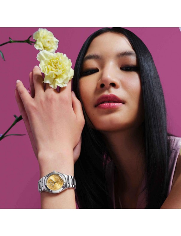 Reloj Swatch Petal Swirl para mujer YLS236G. La caja, la pulsera y el cierre son de acero inoxidable. La esfera mide 33 mm de diámetro. No es sumergible (3ATM) y cuenta con tres años de garantía.